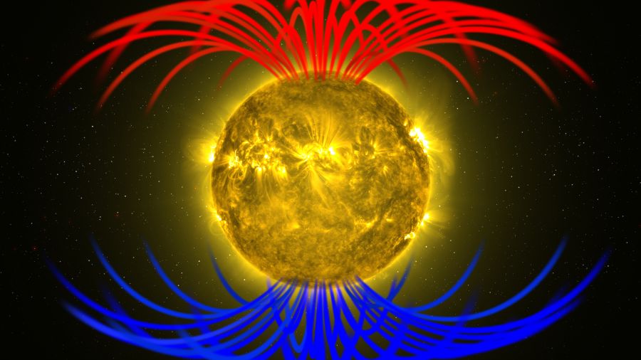 The sun's magnetic field has two poles, like a bar magnet. The poles flip at the peak of the solar activity cycle, every 11 years. A solar wind composed of charged particles carries the magnetic field away from the sun’s surface and through the solar system.